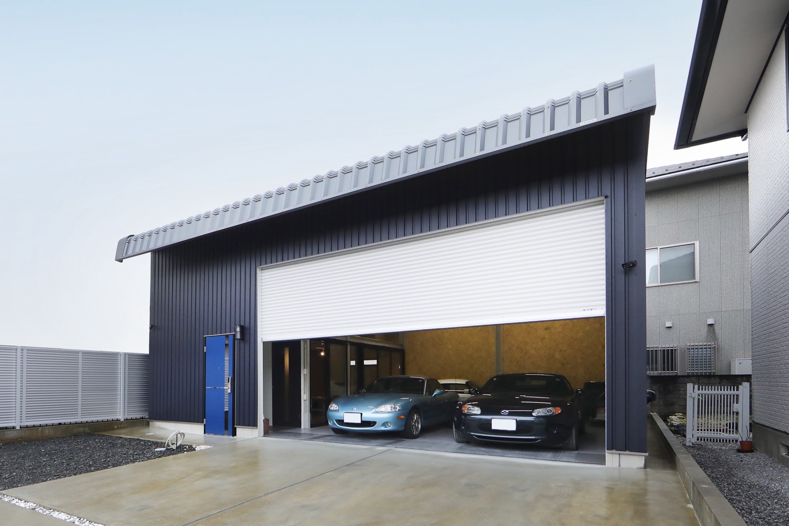 現場ごとに必要な資材をすぐ出し入れできる倉庫と、管理業務を行う事務所を一体化した事例です。移動の手間が減り、現場対応のスピードが向上したことで、業務全体の効率が大きく改善しています。